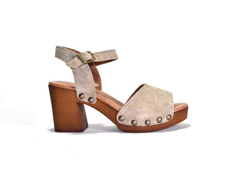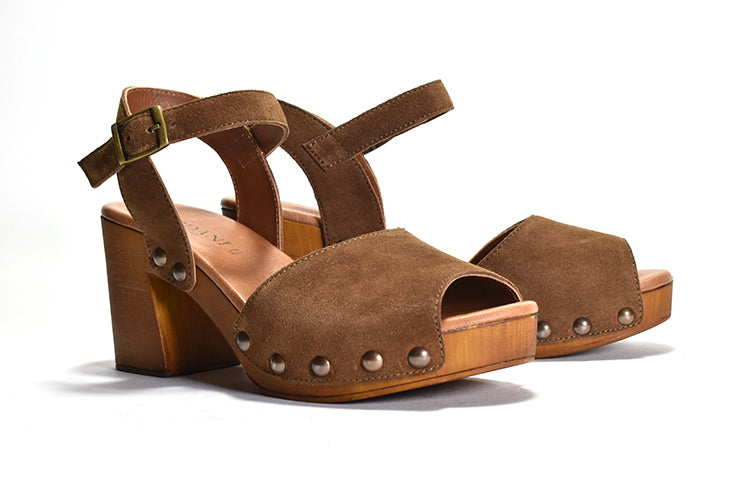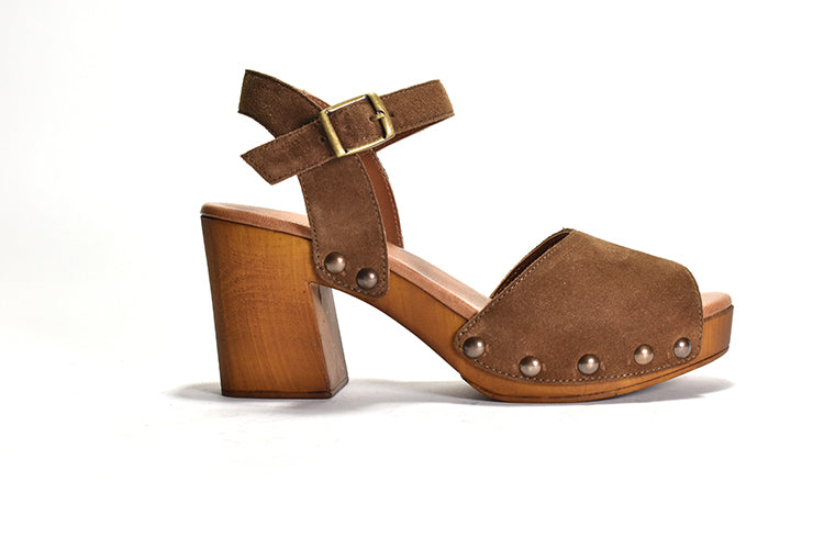 Sandal with ankle strap and stud detail on wood-like platform. Adjustable metal buckle. Lightly padded leather footbed. Leather lining. Rubber sole. Made in Italy.