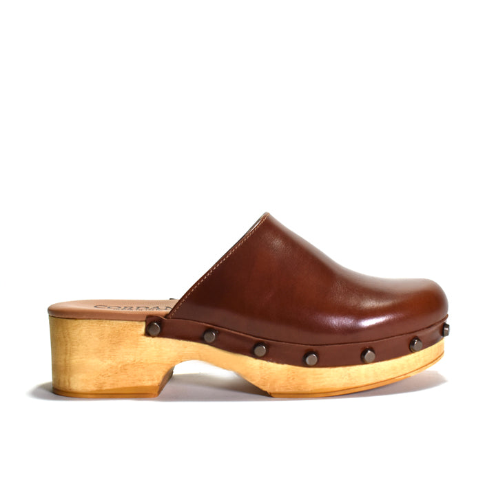 Leather retro clog with stud detail on wood-like bottom. Leather lined, rubber outsole.